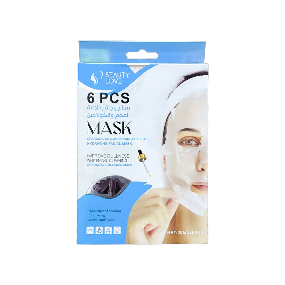 علبة كاملة تحتوي على 6 قطع من أقنعة الفحم والكولاجين المخصصة لتنظيف البشرة بعمق، وترطيبها، وتغذيتها.